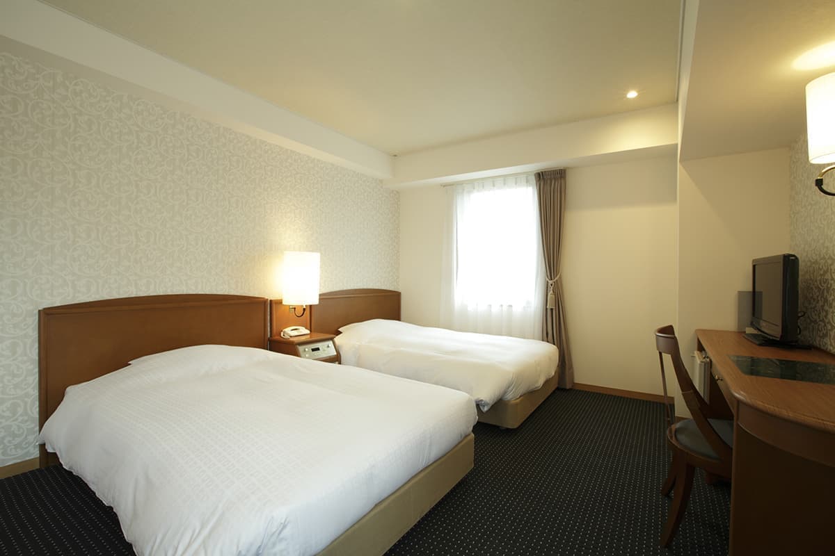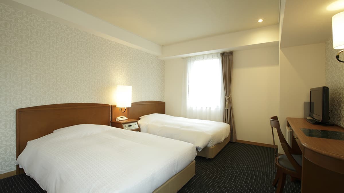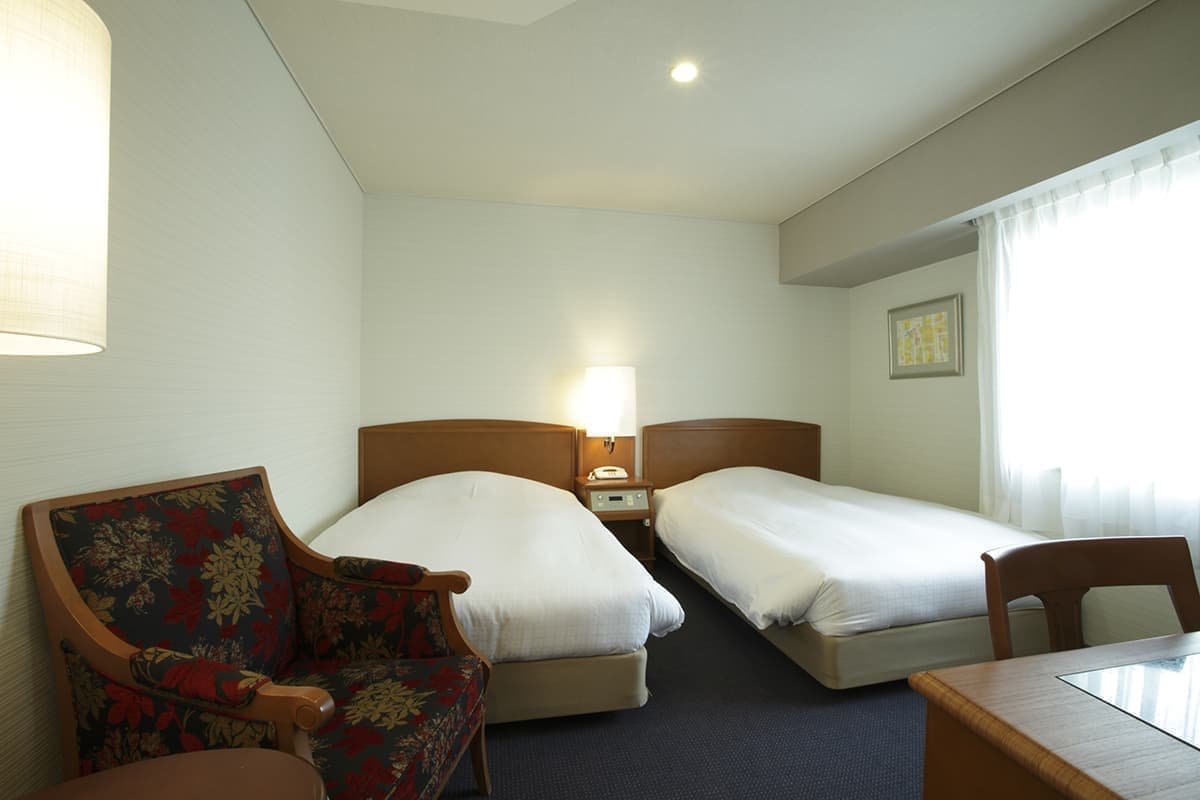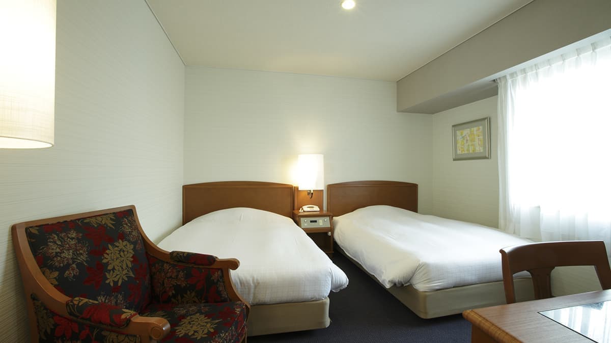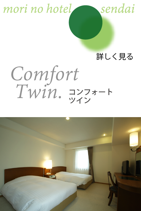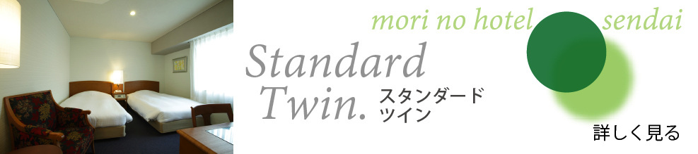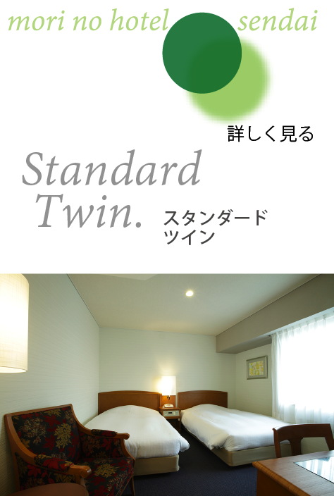 広めのお部屋に、ベッド幅123㎝のセミダブルベッドが2台入った角部屋のツインルームです。窓辺にはカウチソファー、広いライティングデスクを備えた、杜のホテル仙台のスタンダードなお部屋です、